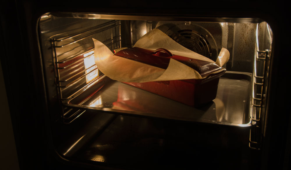 Ställ de tre formarna med bröden i plastbyttan och sätt på locket för en tredje och sista jäsning. Ställ ett galler eller en bakplåt mitt i ugnen. Sätt en avlång gjutjärnsform med lock på plåten. Jag har en pastejform i gjutjärn som bröden gräddas i, men kan använda vilket gjutjärnskärl som helst, så länge det finns ett lock till det. Se bara till att anpassa degarna efter gjutjärnets storlek. Man kan anta att vid gräddning i en oval fyralitersgryta behöver degen inte delas på tre delar, utan all deg går till ett enda bröd. Nu kan du slå på ugnen, förslagsvis 230°C under- och övervärme. Under tiden som ugn och gjutjärn blir varm jäser degen för sista gången, det tar runt en halvtimme.