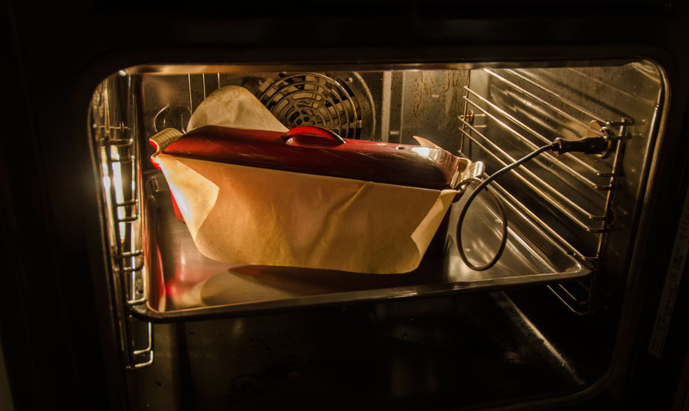 När ugn och gjutjärn nått avsedd temperatur tar man ut gjutjärnet med grytlappar och ställer på ett underlägg, lyft av locket och ställ på underlägget. Ta fram en deg från plastbyttan och lyft över den i gjutjärnsformen genom att hålla i silikonduken var sin sida. Sätt locket på gjutjärnsformen och tillbaka in i ugnen igen. Den här överflytten bör gå så fort som möjligt för att behålla gjutjärnets värme. Sätt en äggklocka på tio minuter och vänta…