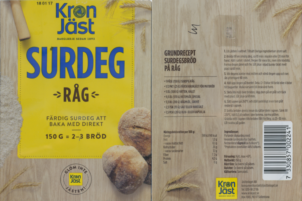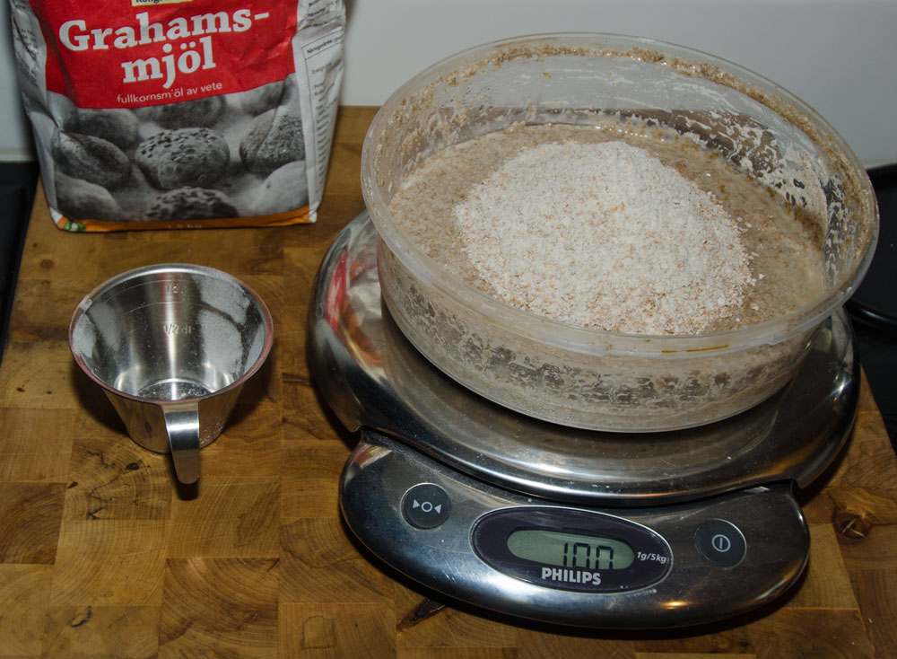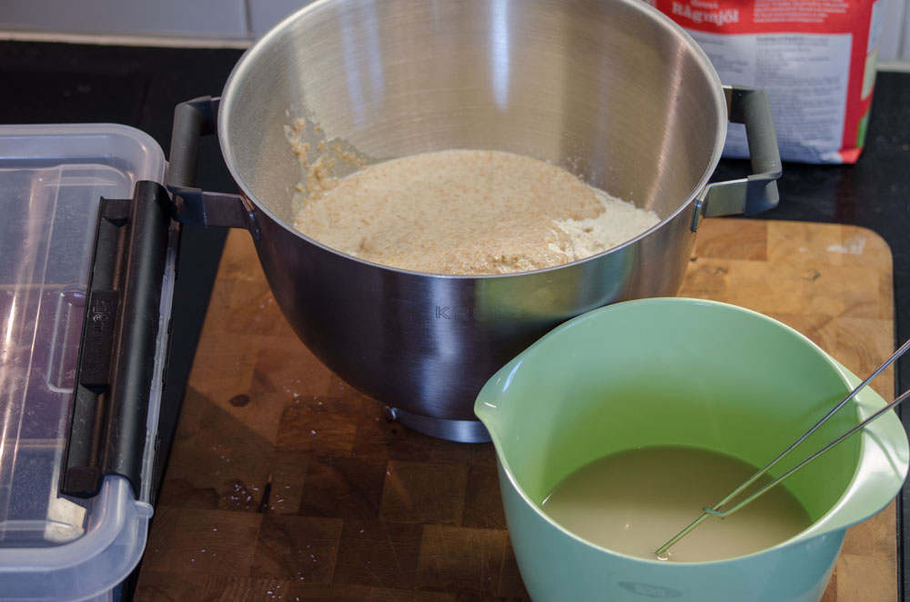 900 g mjöl (en tredjedel surdeg, rågsikt och vetemjöl vardera)