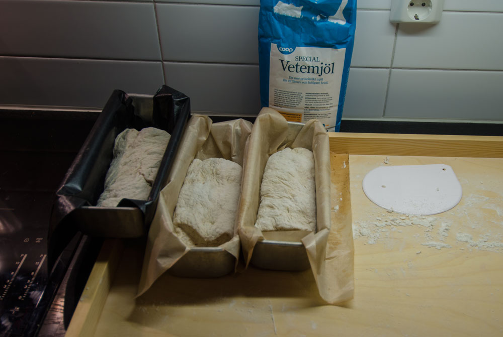 Slå ut den tokjästa degen bakbordet igen, kom ihåg att det måste vara väl mjölat för att hantera den kladdiga degen som dessutom har matolja på ytan. Forma degen med fingrarna till en lång korv, skär den i tre delar och lägg dessa i formbrödsformar med silikonduk inuti, se bilden nedan. Saknas formbrödsformar kan vilka avlånga askar som helst användas, de användas bara för att hålla formen på degarna under tredje jäsningen.
