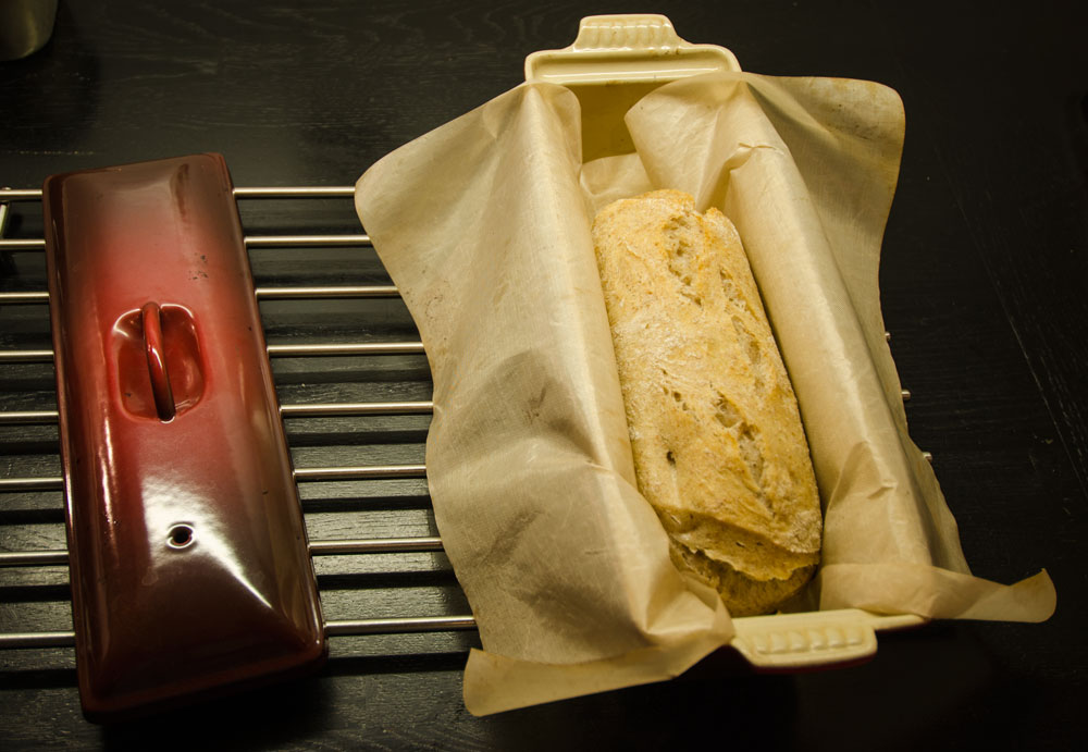 Det finns en månghundraårig europeisk tradition att laga mat och baka i tjocka grytor täckta med lock, så kallade Dutch ovens. Man kan göra bröden beskrivna här på det sättet också, nämligen med den gamla ärvda (eller dyrt nyinköpta) gjutjärnsgrytan. Så, istället för att dela upp degen i tre delar, tar man den i ett enda stycke och lägger ner den i den stora grytan, jag har använt en fyraliters gryta från Kockums Jernverk som jag ärvde från pappas kusin. Det enda viktiga här att handtag och knoppar på locket måste vara värmebeständiga så att de inte smälter eller brinner upp i ugnen. Om grytan är oval eller cirkulär har såklart enbart inverkan på brödets form. Avbakning i den stora grytan tar mycket längre tid än i de små pastejformarna som används ovan, man kan vänta 20 minuter innan ugnstermometern sticks in i degen under locket. Sedan tar det ytterligare en halvtimme innan brödets kärna har nått 97°C temperatur och kan tas ut.