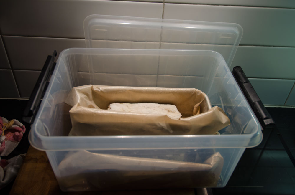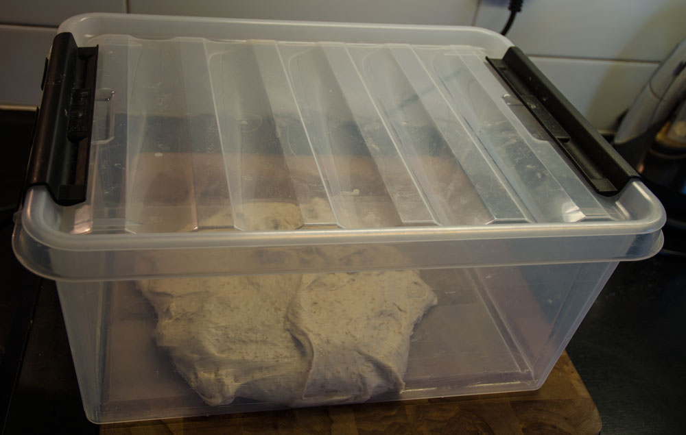 Lyft över den kladdiga degen i en inoljad plastlåda med lock, jag använder en tioliterslåda som finns hos Bauhaus. Här får degen vila i 90 minuter. Du kan såklart låta jäsningen ske i maskinens bunke där degen redan ligger och bara täcka över med Gladpack, risken är att bunken inte är tillräckligt stor så att degen jäser över, testa själv! Stöt sedan samman degen på ett mjölat bakbord, vik ihop degen med skarven neråt och lägg tillbaka i plastlådan för en andra jäsning i ytterligare 90 minuter. Tips: Ställ bunke och degkrokar i kallt vatten omedelbart eller ännu bättre, diska ur dem med ljummet vatten och diskborste med det samma. Om degrester får torka på prylarna blir det klart jobbigare att diska.