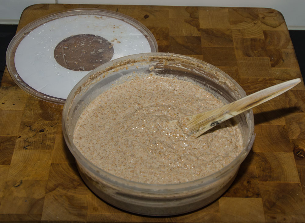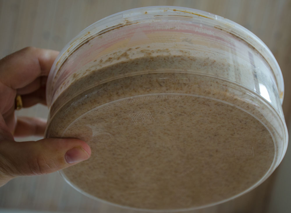 Häll 625 g vetemjöl special i bunken. Häll sedan över 250 g av din nymatade surdeg i bunken, efter detta kan du trycka på locket till surdegsbyttan, ställa in den i kylen och glömma den tills det är dags att baka igen. Vispa ut ett halvt paket jäst med 337 g ljummet vatten och häll detta över mjölet i bunken.