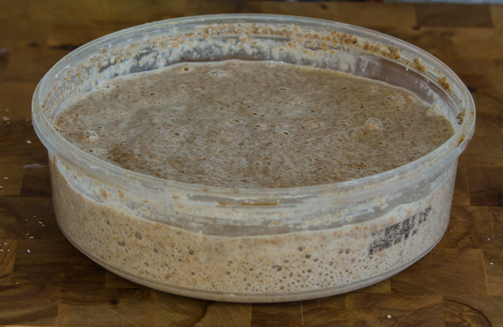 Tryck på ett lock men låt det stå på glänt och låt stå i tolv timmar i ganska varm miljö. På vintern när innetemperaturen kan sjunka en del, har jag flera gånger ställt surdegen på tillväxt i badrummet med elementets termostat höjd till 25°C. Nu skall surdegen ha börjat bubbla och ta fart, lite som på bilden här: