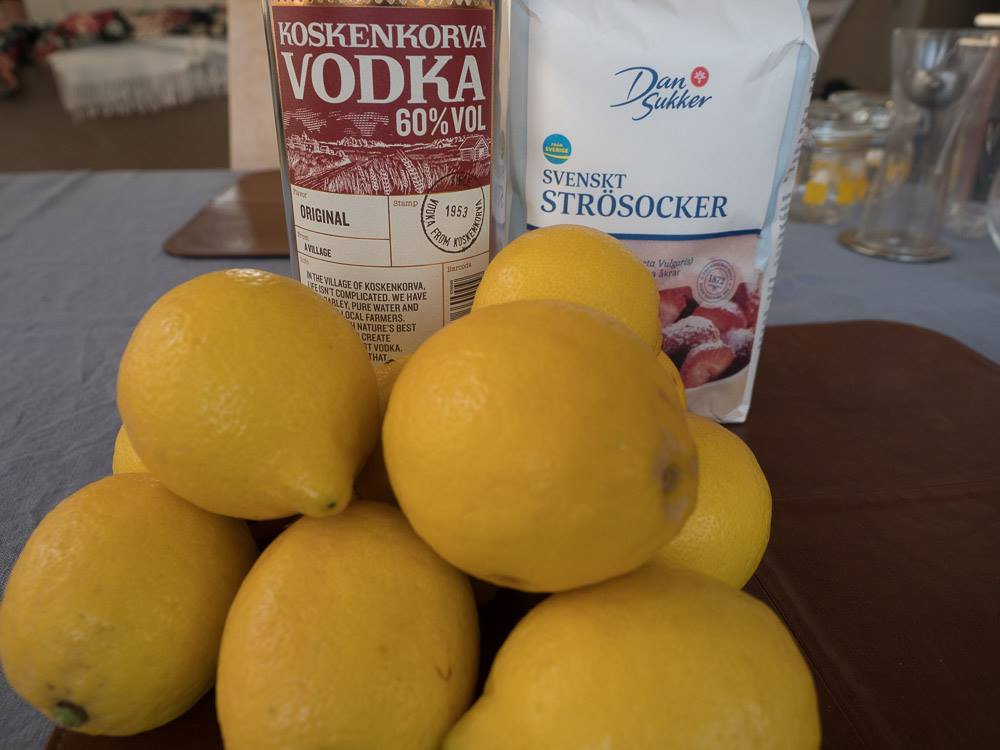 En flaska Kosken, tio citroner och lite sockerlag, thats it. Blanda zesten från de tio citronerna med vodkan i en vaccpåse och låt det stå i två timmar @ 57C, sila av och tillsätt sockerlag efter smak. I det här fallet blev det 3 dl socker 1:1, vilket sänkte alkoholstyrkan från 60 % till ca 46 %, kanske fortfarande något för starkt, men jag tänkte att om det dricks iskallt blir sötman och styrkan bra.