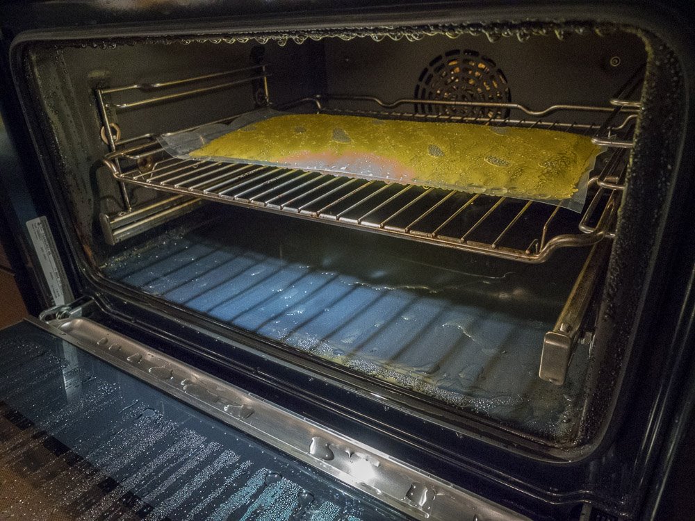 När ugnen blivit varm lyfts degen över i en silikonduk.