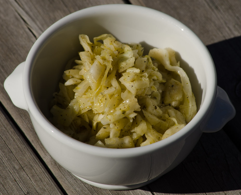Låt vattnet rinna av och lägg över den skållade vitkålen i en bunke.