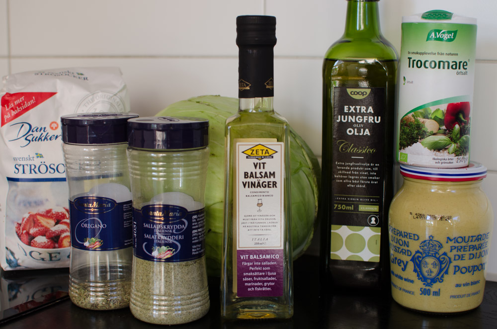 Rör ihop resten av ingredienserna i egen bytta och häll över vitkålen.